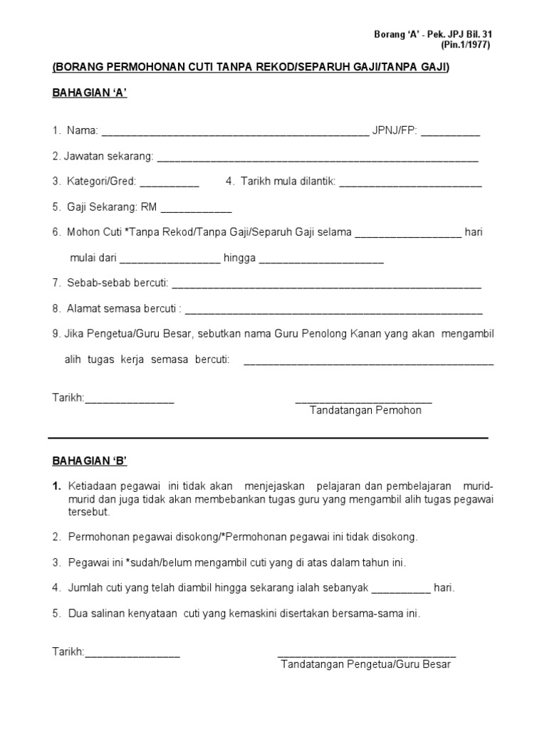 Tandatangan & cop ketua jabatan / unit kelulusan pengarah permohonan cuti tanpa rekod ini : Kerajaan telah meluluskan hak untuk mengambil cuti tanpa rekod buat penjawat awam sama ada islam mahupun bukan islam atas alasan keagamaan, kata menteri kewangan, lim guan eng. Pekeliling kelayakan cuti tanpa rekod guru sebagai penjawat awam layanlah berita terkini tips berguna maklumat. Bahagian i dan ii adalah benar. Cuti isteri bersalin (7 hari) cuti gantian (tidak termasuk cuti gantian kerana kerja lebih masa) cuti majlis saya mengaku bahawa maklumat yang diberikan adalah benar dan memohon kelulusan menggunakan kemudahan cuti tanpa rekod.